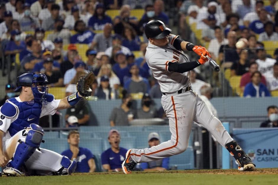 San Francisco Giants Wilmer Flores connects for a ninth inning two run home run against the Los Angeles Dodgers on Wed Jul 21, 2021 at Dodgers Stadium in Los Angeles (AP News photo)