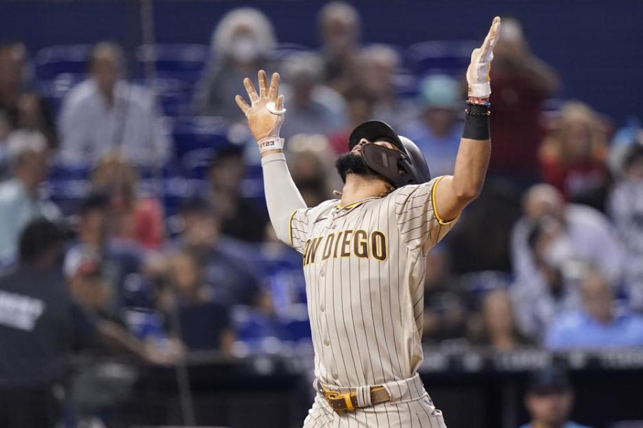 San Diego Padre’s Fernando Tatis Jr thanks the good Lord for hitting a home run against the Miami Marlins in the first inning but it wasn’t enough as the Padres fell to the Marlins 3-2 on Sat Jul 24, 2021. The Oakland A’s travel to face Tatis and the Padres in San Diego for a two game series on Tue Jul 27, 2021 (AP News photo)