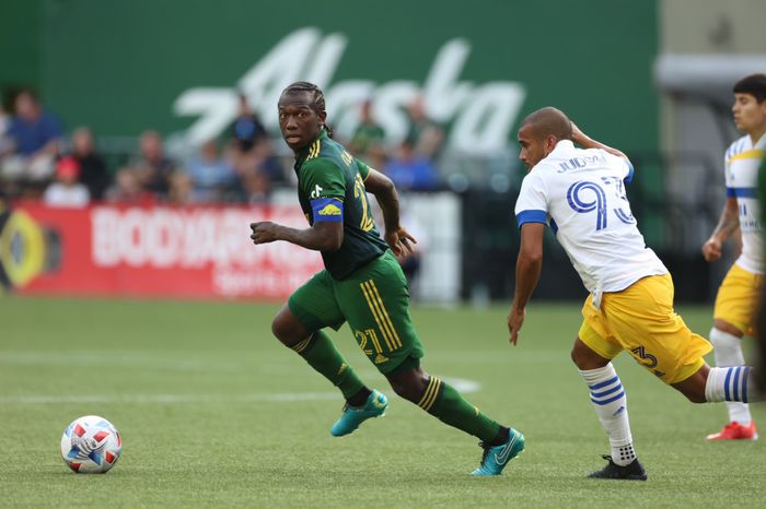 The Portland Timbers Diego Chara (21) gets away from a San Jose Earthquakes defender at Providence Park in Portland on Wed Aug 4, 2021 (photo from oregonlive.com)