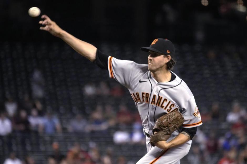San Francisco Giant starter Kevin Gausman throws to the Arizona Diamondbacks line up in the first inning at Chase Field in Phoenix on Wed Aug 4, 2021 (AP News photo)