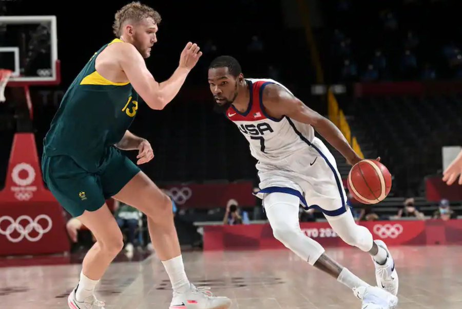 Team USA’s Kevin Durant (right) driving against Australian player (left) led Team USA with 23 points on Thu Aug 5, 2021 in the 2021 Tokyo Olympics (photo from cbssports.com)