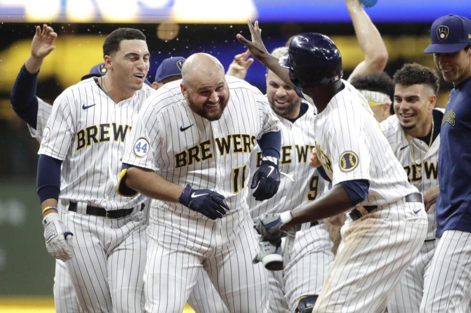 All my Rowdy friends, the Milwaukee Brewers Rowdy Tellez gets congratulations after knocking in the game winning runner Avisail Garcia with a walk off single in the tenth inning on Fri Aug 6, 2021 at Miller Park in Milwaukee (AP News photo)