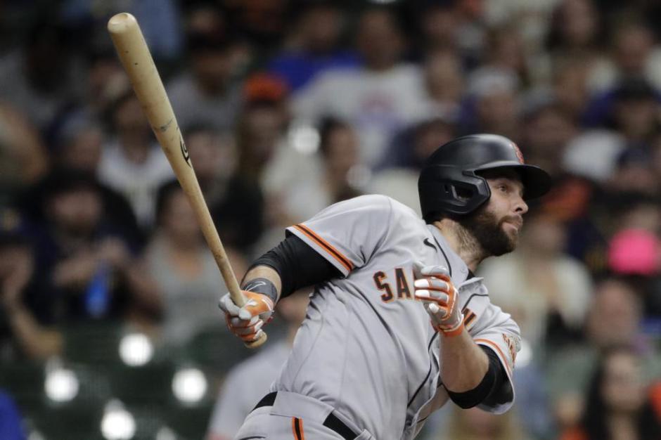 San Francisco Giants slugger Brandon Belt who has had a great deal with the home run ball during the Giants trip in Milwaukee is seen here hitting one out in the 11th inning for a two run homer on Sat Aug 7, 2021 against the Milwaukee Brewers (AP News photo)