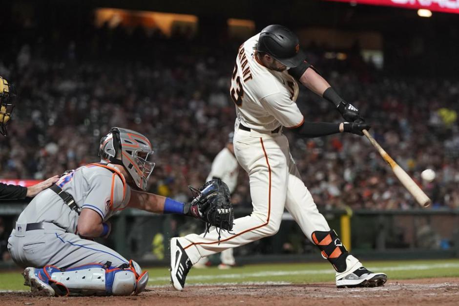 San Francisco Giant hitter Kris Bryant hits a two run homer in the bottom of the fifth inning one of two home runs in the game against the New York Mets. Mets catcher James McCann can only watch after Bryant hits the big fly on Mon Aug 16, 2021 at Oracle Park in San Francisco (AP News photo)