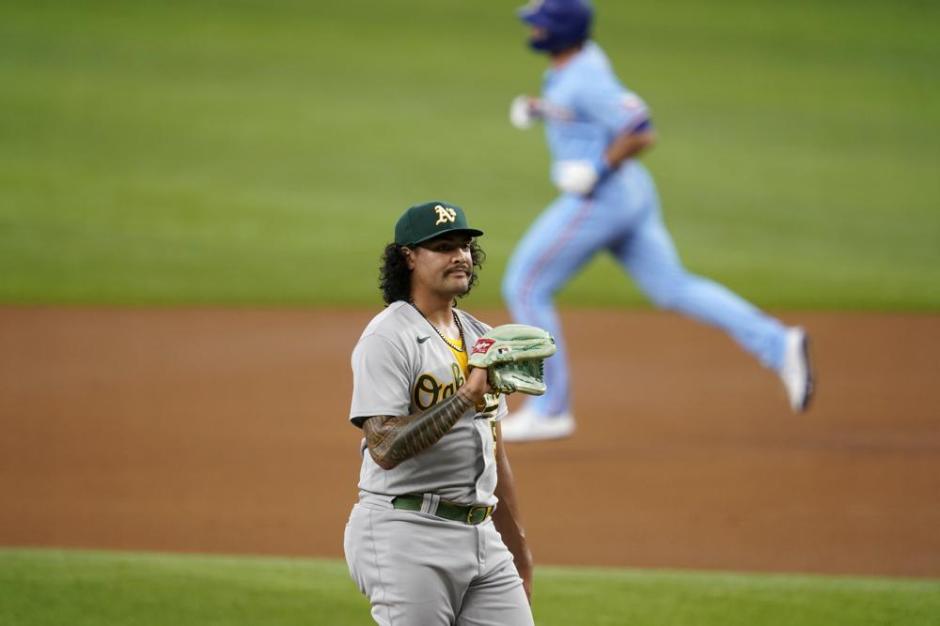 Oakland A’s pitcher Sean Manaea gives up the big fly a two run homer to the Texas Rangers DJ in the first inning at Globe Life Field in Arlington (AP News photo)