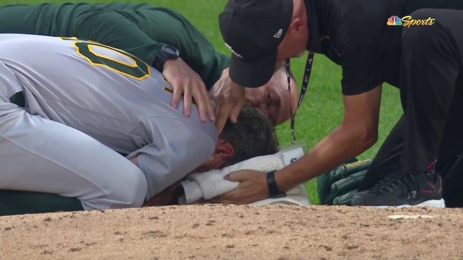 Oakland A’s pitcher Chris Bassitt (40) took a line drive around the area of his eye by the Chicago White Sox hitter Brian Goodwin. Bassitt was taken to the hospital and is getting x-rayed on Tue Aug 17, 2021 in Chicago (photo from @BrodieNBCS)