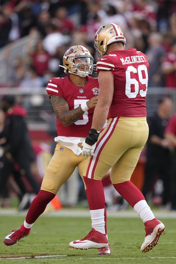 #2 Head coach Kyle Shanahan had a good look at Lance keeping him in for much of the second quarter. Lance threw 5-14 for 128 yards, and one touchdown and stayed in pocket pretty for much for his throws.