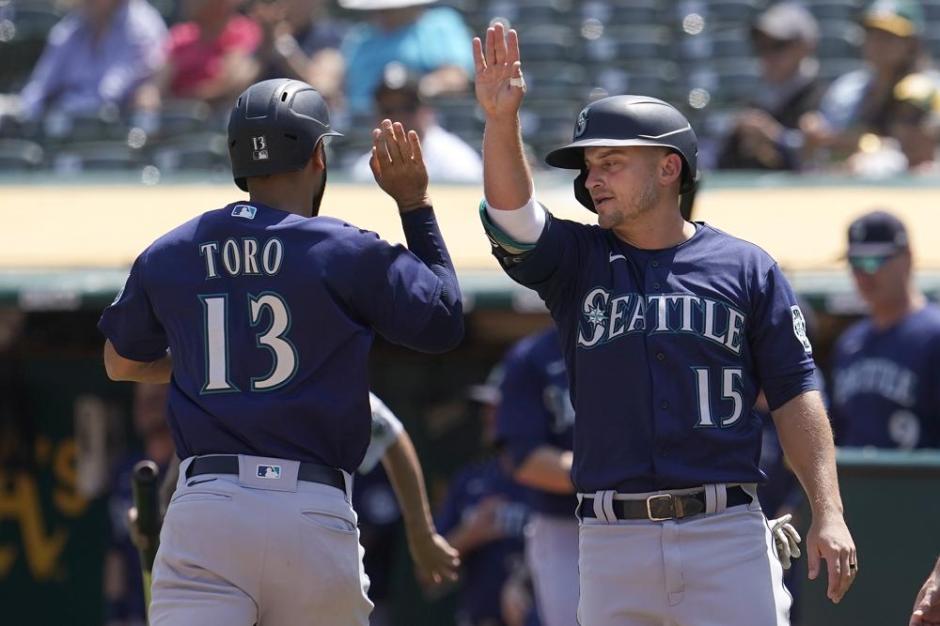Seattle Mariners Abraham Toro (13) gets congratulated by teammate Kyle Seagar (15) after both scored on a Luis Torrens two run single in the top of the third inning that proved to be the gamer as the Mariners sweep the Oakland A’s on Tue Aug 24, 2021 at the Oakland Coliseum (AP News photo)