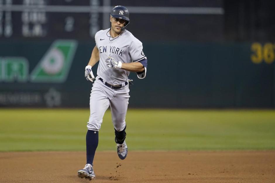 Giancarlo Stanton rounds the bases for the New York Yankees after hitting a master blaster 472 feet for a home run off Oakland A’s starter Sean Manaea at the Oakland Coliseum on Fri Aug 27, 2021 (AP News photo)