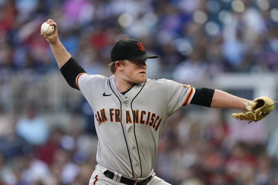 San Francisco pitcher Logan Webb held the Atlanta Braves in seven innings to five hits throws against the Braves line up in the first inning on Sat Aug 28, 2021 at Suntrust Field in Cobb County (AP News photo)