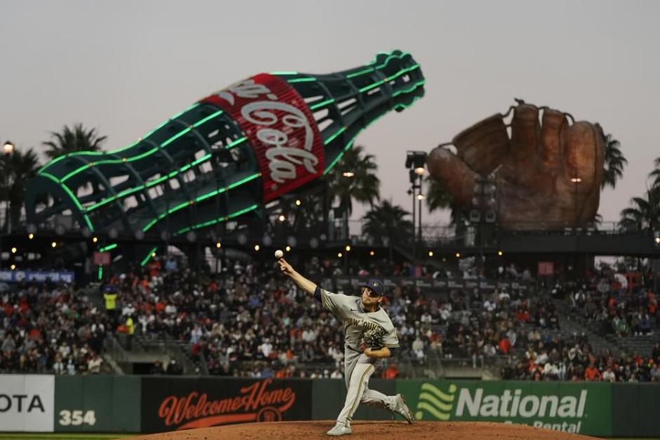Milwaukee Brewers starter Corbin Burnes throws to the San Francisco Giants line up in the bottom of the third inning at Oracle Park in San Francisco (AP News photo)