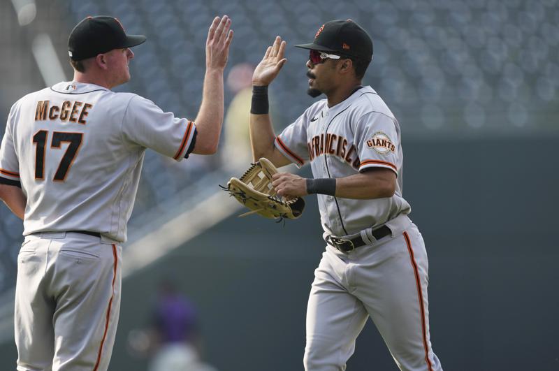 San Francisco Giants closer Jake McGee (left) congratulates right fielder LaMonte Wade Jr (right) following the last out after Wed Sep 8, 2021 game against the Colorado Rockies in Denver (AP News photo)