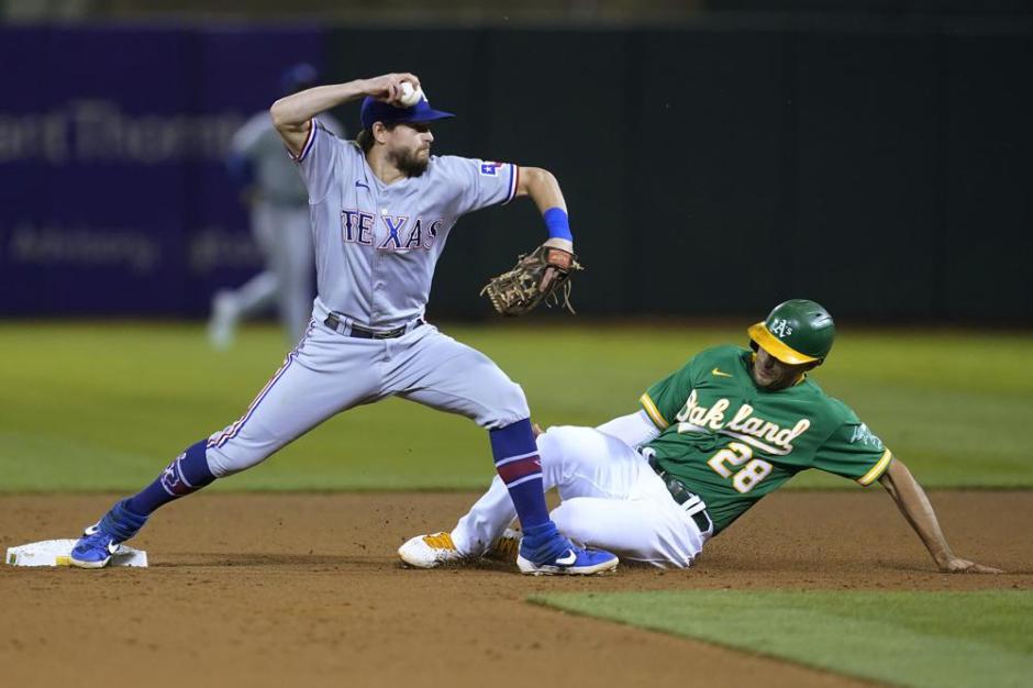 Matt Olson (28) who had four RBIs for the Oakland A’s slides into second under Texas Rangers second baseman Nick Solak was forced out Solak makes the throw to first base to complete the double play at the Oakland Ring Central Coliseum in Oakland on Fri Sep 10, 2021 (AP News photo)