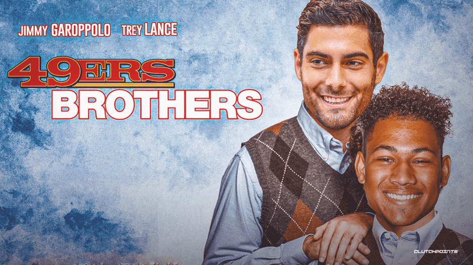 Love the duds. San Francisco 49ers quarterbacks Jimmy Garoppolo in checkered sweater (left) and Trey Lance in checkered sweater (right) are the 49ers Brothers and will be sharing duties under center at Ford Field in Detroit on opening day Sun Sep 12, 2021 (image from Clutch Points)
