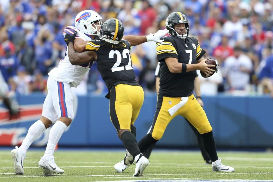 The Las Vegas Raiders match up against the Pittsburgh Steelers this Sun Sep 19th. Here Steelers quarterback Ben Roethlisberger (7) looks to avoid traffic and looks down field for a receiver as Buffalo Bills outside linebacker Matt Milano (left) tries to break free from the grasps of Steelers Najee Harris (22) on Sun Sep 12, 2021 at Orchard Park NY (AP News photo)