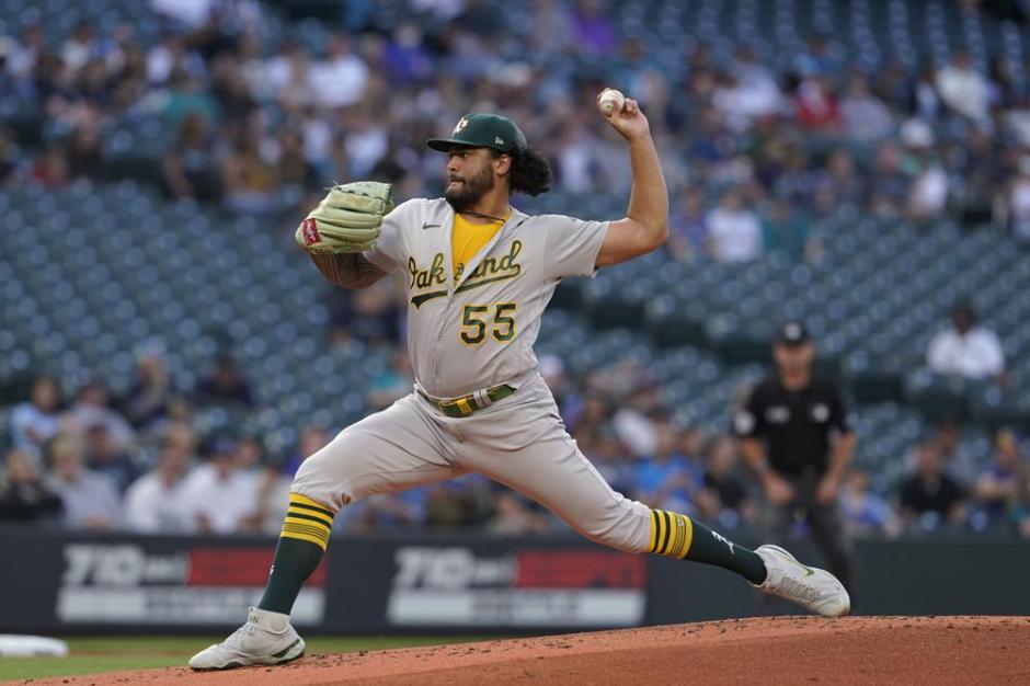 Oakland A’s starter Sean Manaea pitching against the Seattle Mariners in this Jul 21, 2021 photo at T Mobile Field in Seattle will start against the Houston Astros on Fri Oct 1, 2021 at Minute Maid Field in Houston (AP News file photo)