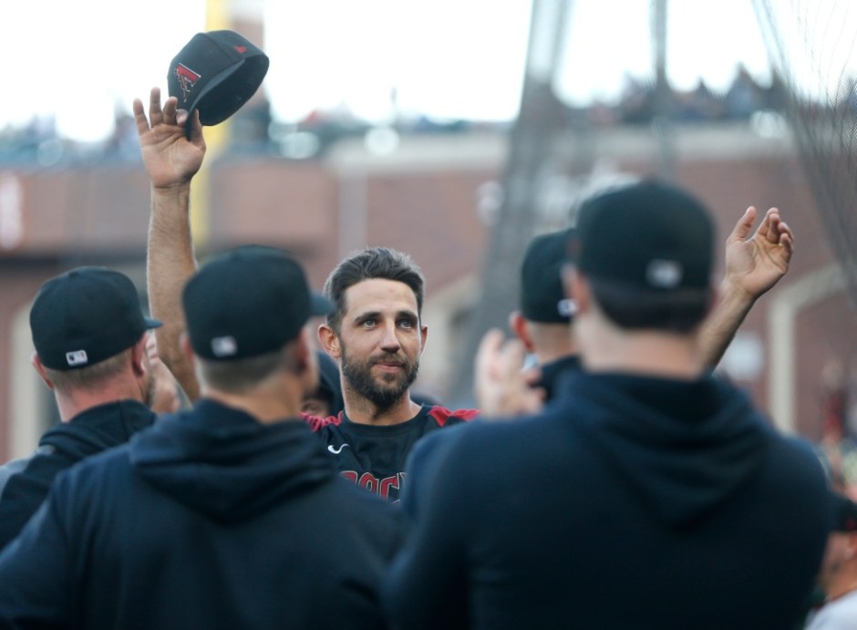 Arizona Diamondback pitcher Madison Bumgarner doffs his cap during his last trip in San Francisco against his former team the San Francisco Giants on Aug 10, 2021. Bumgarner will be making his first start at Oracle Park for this season against his former team Thu Sep 30, 2021. (file photo by Bay Area News Group)