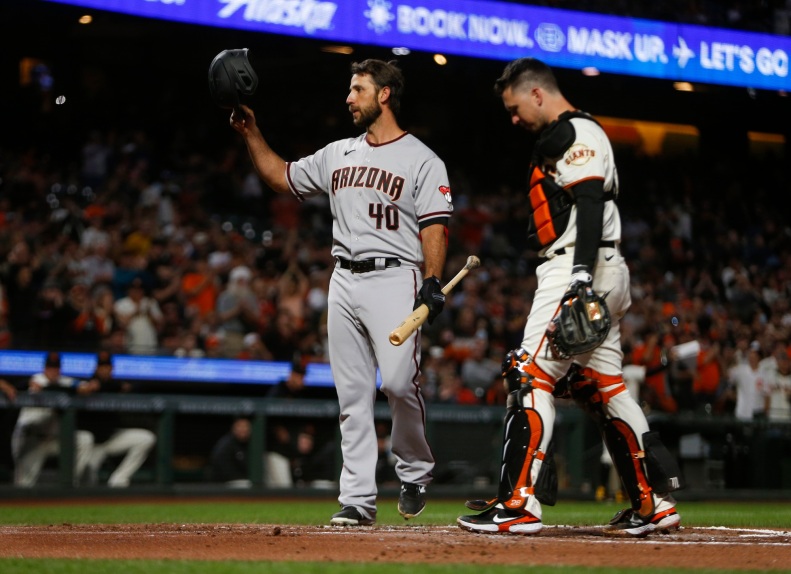 Bumgarner–pitching for the first time in San Francisco wearing another uniform other than the Giants’–received a pair of well-deserved and loud ovations from the crowd of 27,503. In a twist that only baseball can provide, the second of those ovations came in the top of the first inning, not the bottom with him on the mound. At that point, Bum was the ninth batter of the inning with the D’Backs already leading 3-0. Despite the gravity of the game at that juncture, the lefty’s welcome was genuine. Genuine enough that he paused before stepping into the box and briefly waved his batting helmet.