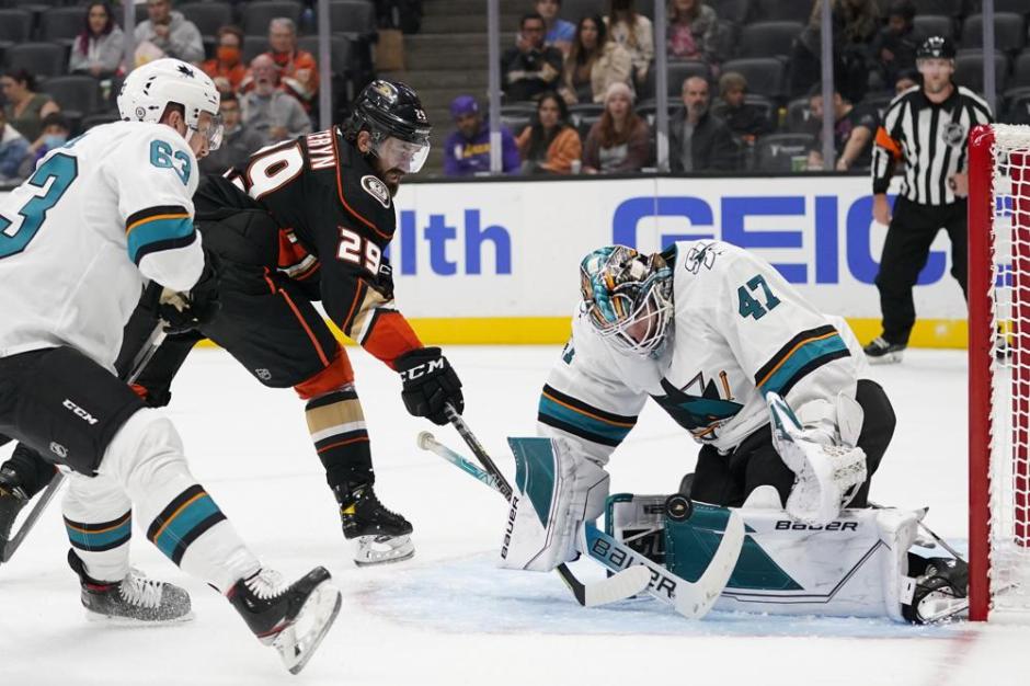 Anaheim Ducks James Pateryn (29) puts one on net against San Jose Sharks goaltender James Reimer (47) during Thu Sep 30, 2021 exhibition game at the Honda Center in Anaheim (AP News photo)