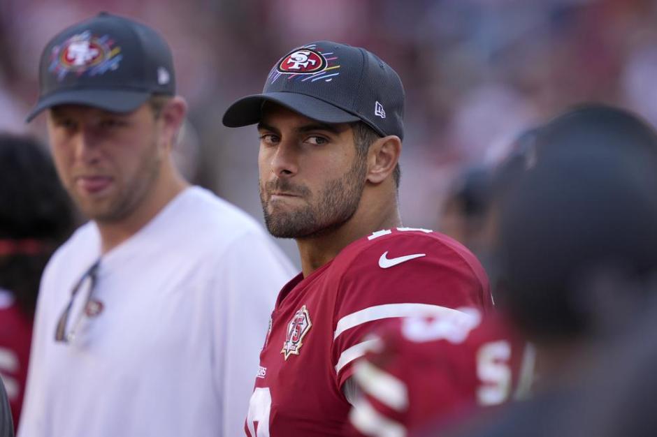 San Francisco 49ers quarterback Jimmy Garoppolo watched from the sidelines during the second half after injuring his calf against the Seattle Seahawks at Levi Stadium in Santa Clara on Sun Oct 3, 2021 (AP News photo)