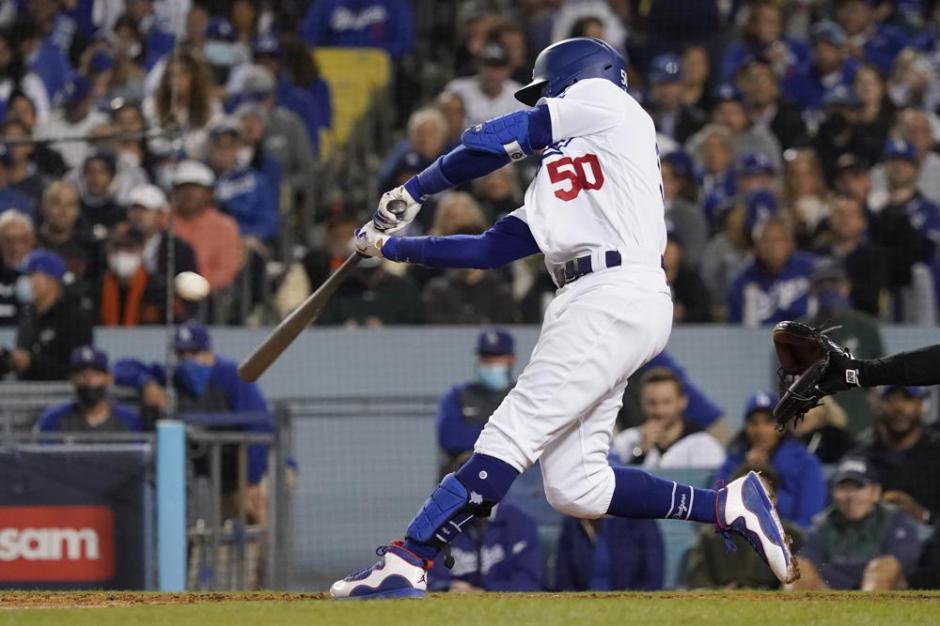 Bottom of the fourth inning the Los Angeles Dodgers cracks a bottom of the fourth inning home run against the San Francisco Giants on Tue Oct 12, 2021 at Dodgers Stadium in Los Angeles (AP News photo)