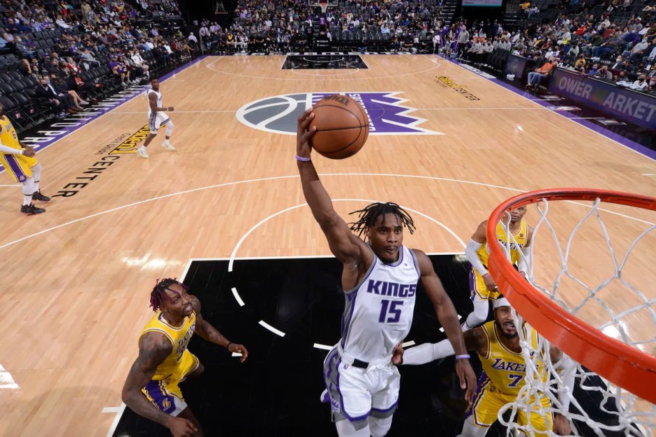 The Sacramento Kings Davion Mitchell throws down against the Los Angeles Kings in the final pre season game at the Golden One Center in Sacramento on Thu Oct 14, 2021 (photo from sbnation.com)