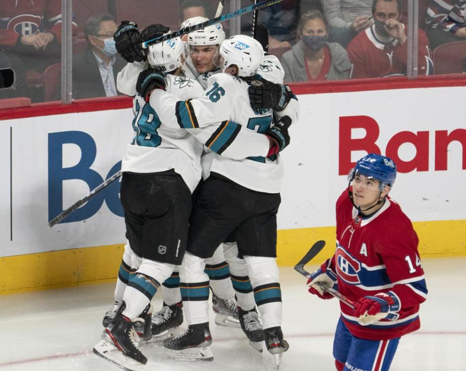 First period action San Jose Sharks rookie Jonathan Dalhen (76) scores his first goal against the Montreal Canadiens Dalhen receives congratulations from teammates Mario Ferraro (38) and Timo Meier (28) as the Habs Nick Suzuki (14) can only skate away at the Bell Centre in Montreal on Tue Oct 19, 2021 (Canadian Press photo)