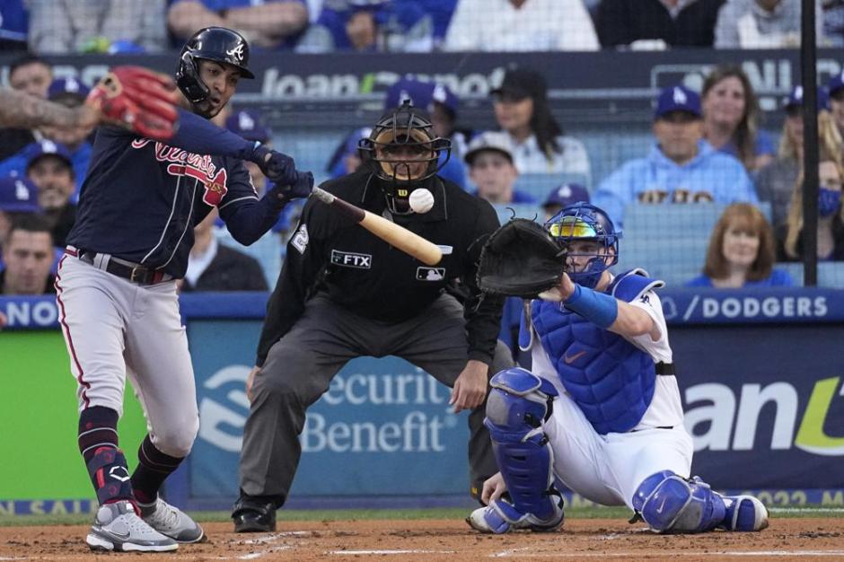 The balls were flying out of Dodgers Stadium in Los Angeles on Wed Oct 20, 2021 in game 4 of the NLCS as the Atlanta Braves Eddie Rosario connected for one of four Braves home runs this one being hit the top of the second inning (AP News photo)