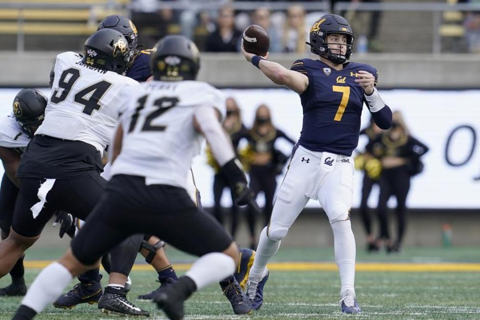 The Cal Bears quarterback Chase Garbers (7) throws past the Colorado Buffaloes defense in the second half on Sat Oct 23, 2021 at Cal Memorial Stadium (AP News photo)