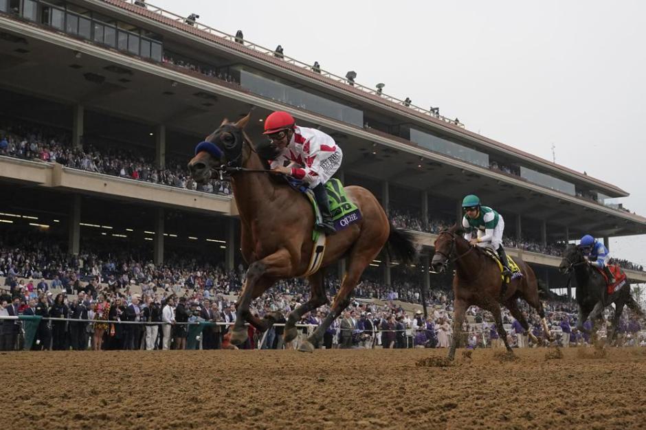 Corniche crosses the finish line with Jockey Mike Smith at the Breeders Cup at Del Mar on Fri Nov 5, 2021 (AP News photo)