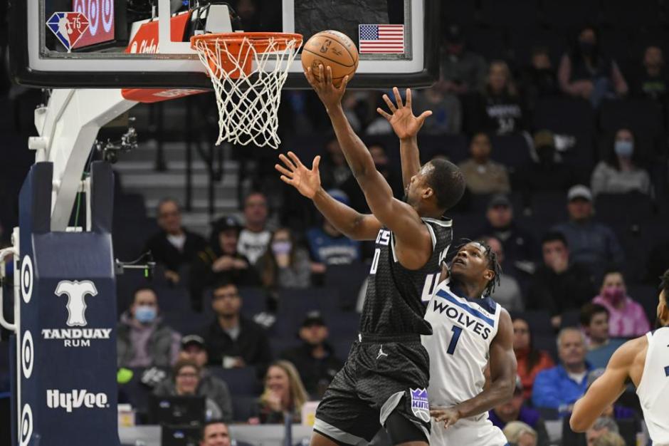 Sacramento Kings forward Harrison Barnes, left, tries to get a hook shot over Minnesota Timberwolves guard Anthony Edwards at the Target Center in Minneapolis on Wed Nov 17, 2021 (AP News photo)