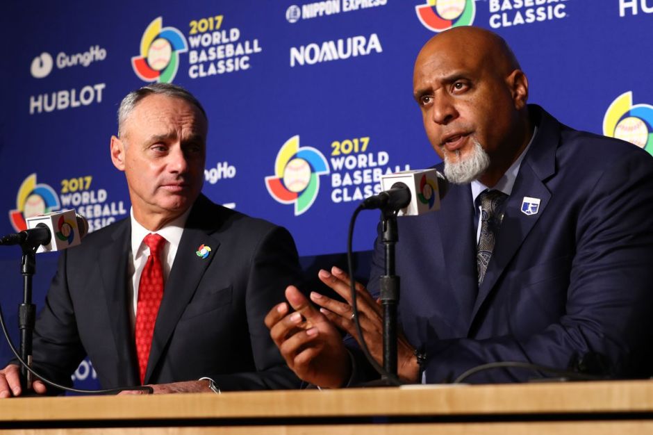 MLB Commissioner Rob Manfred (left) and Tony Clark MLB Players Association Executive Director (right) seen in file photo during the 2017 World Baseball Classic. Will both sides get a happy medium worked out before the CBA expires on Dec 1, 2021 before the owners lock out the players (file photo by Bleed Cubbie Blue)
