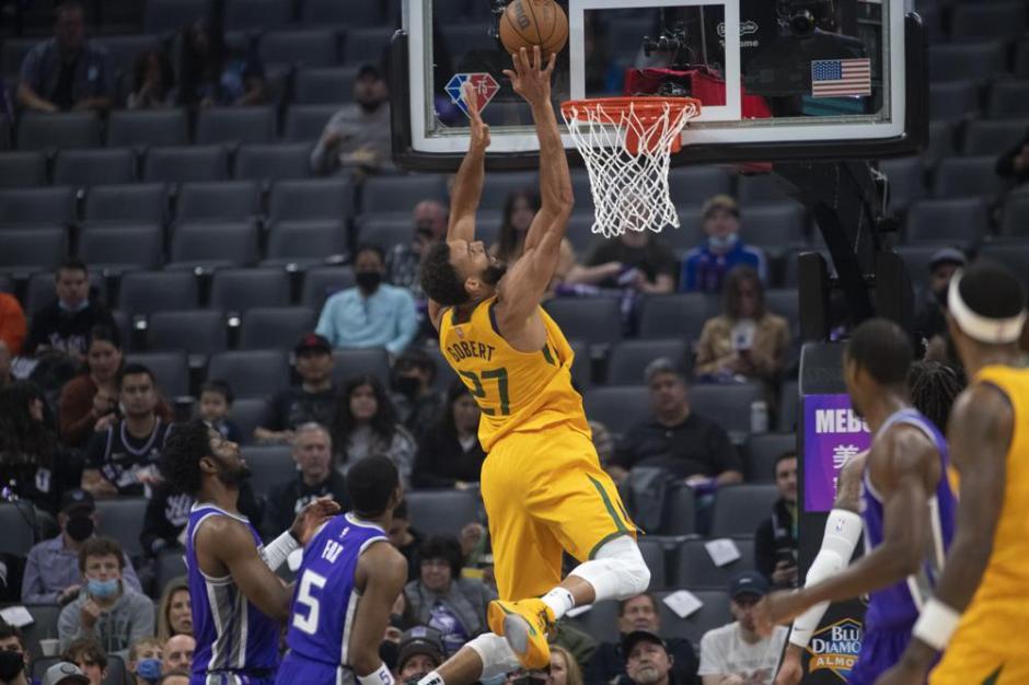 All too easy for the Utah Jazz center Rudy Gobert (27) who scores against Sacramento Kings defense in first quarter action at Golden One Center in Sacramento on Sat Nov 20, 2021 (AP News photo)