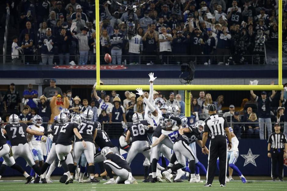 The Las Vegas Raiders (6-5) kicker Daniel Carlson kicked the game winning field goal in overtime to just get the Raiders by the Dallas Cowboys (7-4) on Thanksgiving Day Thu Nov 25, 2021 36-33. It was a real nail biter the Raiders had just enough to stay ahead of the Cowboys throughout the game and got into overtime to get Carlson in good field position to boot the 29 yarder for the winner.
