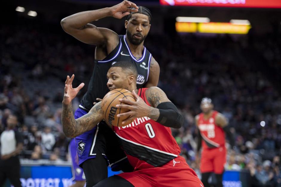 Portland Trail Blazers guard Damian Lillard (0) dribbles to get past Sacramento Kings center Tristan Thompson (13) during Wed Nov 24, 2021 at the Chase Center in Sacramento (AP News photo)