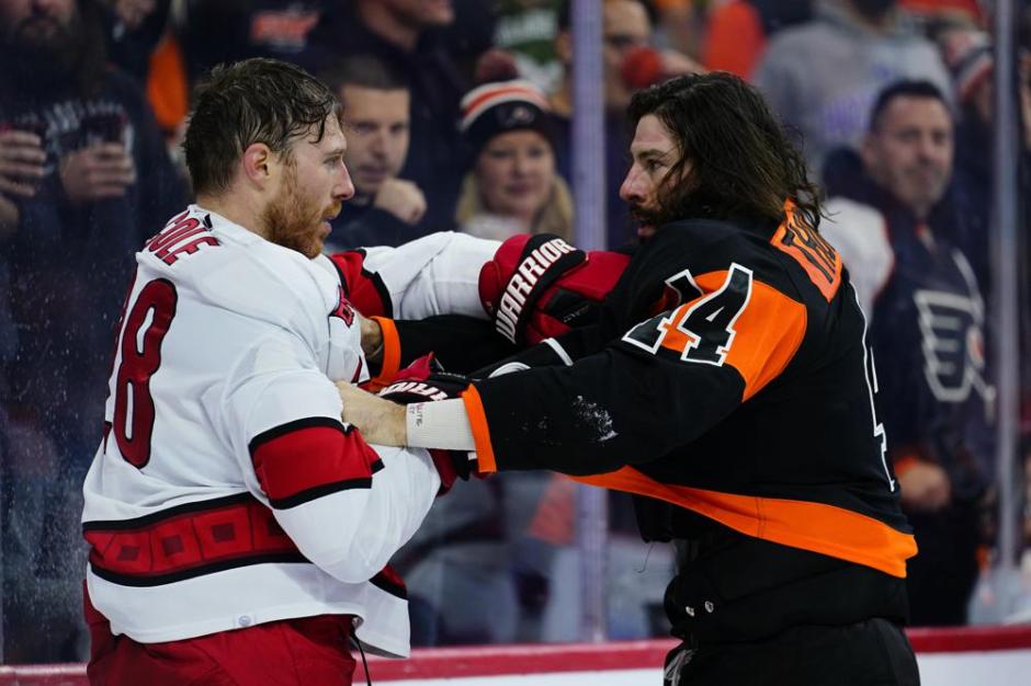 Carolina Hurricanes’ Ian Cole, left, and Philadelphia Flyers’ Nate Thompson (right) rumble in the second period of Fri Nov 26, 2021 in Philadelphia at the Wells Fargo Center (AP News photo)