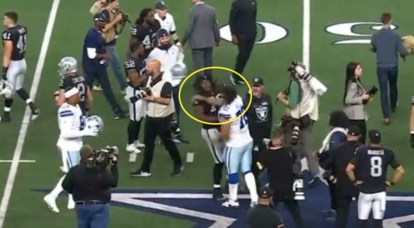 Dallas Cowboys defensive lineman Trysten Hill in yellow circle throws punch knocking Raider lineman John Simpson’s helmet off in a post game confrontation at AT&T Stadium in Arlington on Sun Nov 28, 2021 (Larry Brown Sports photo)