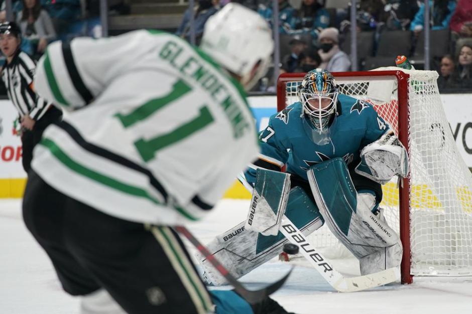 San Jose Sharks goaltender James Reimer, rear, defends against a shot by Dallas Stars center Luke Glendening (11) at SAP Center in San Jose Sat Dec 11, 2021 (AP News photo)