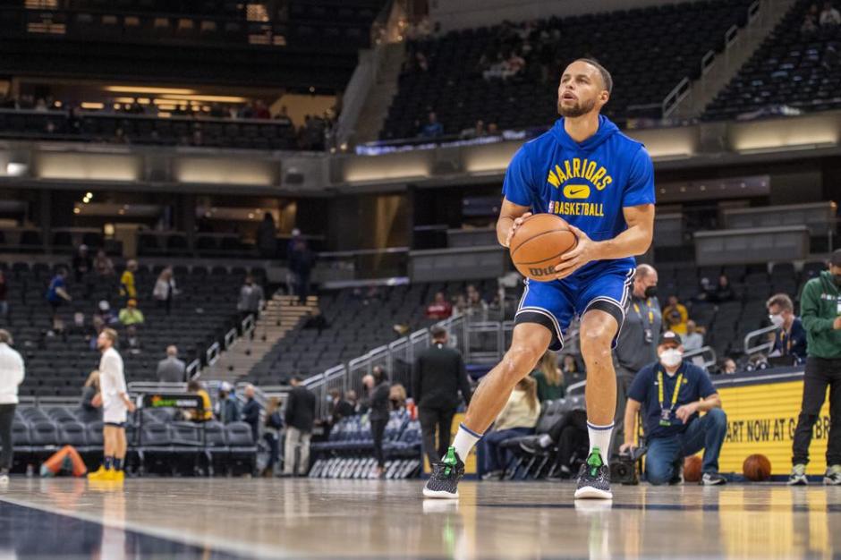 Golden State Warriors guard Stephen Curry takes a practice shot before their game against the Indiana Pacers at Gainbridge Field House in Indianapolis on Mon Dec 13, 2021 (AP News photo)