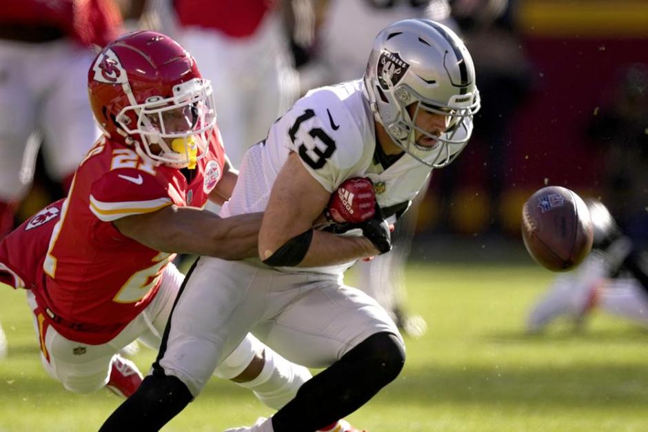 Las Vegas Raiders wide receiver Hunter Renfrow (13) is hit from behind by Kansas City Chiefs cornerback Mike Hughes (21) who forces a fumble in the first half of Sun Dec 12, 2021 game in Kansas City’s Arrowhead Stadium. The Raiders face the Cleveland Browns this Sun Dec 19, 2021 at EnergyFirst Stadium in Cleveland (AP News photo)