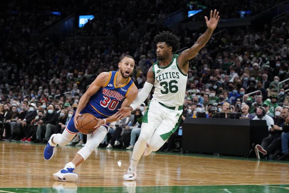 Golden State Warriors guard Stephen Curry (30) dribbles past Boston Celtics guard Marcus Smart (36) at TD Garden in Boston on Fri Dec 17, 2021 (AP News photo)