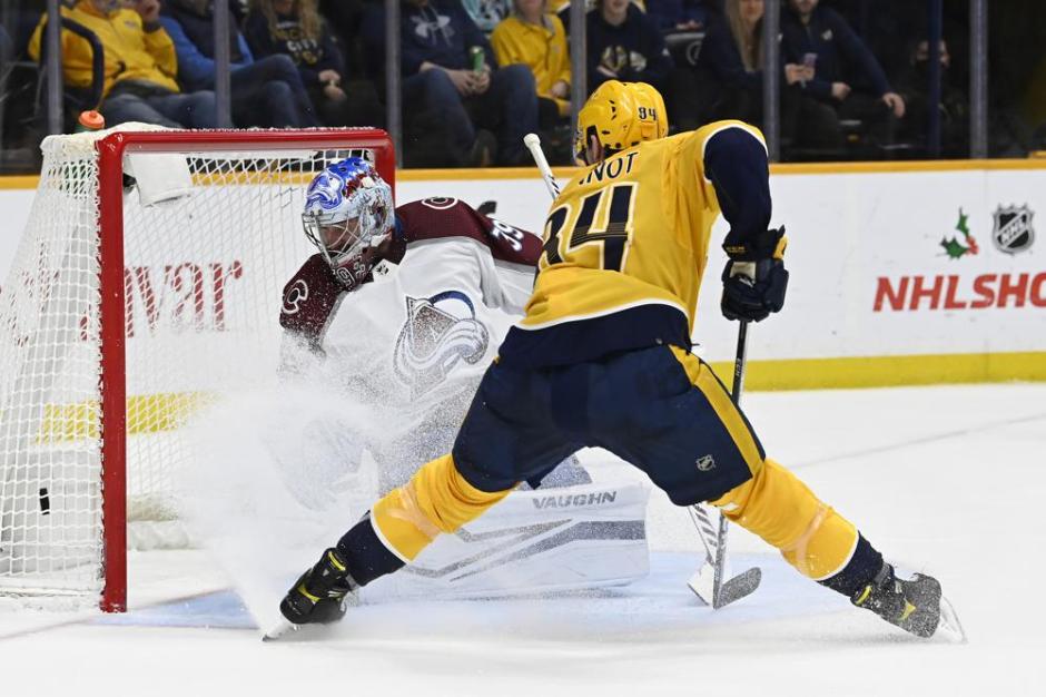 Nashville Predators left wing Tanner Jeannot (84) watches as teammate left wing Filip Forsberg scores on Colorado Avalanche goaltender Pavel Francouz (39) Thu Dec 16, 2021 in Nashville (AP News photo)