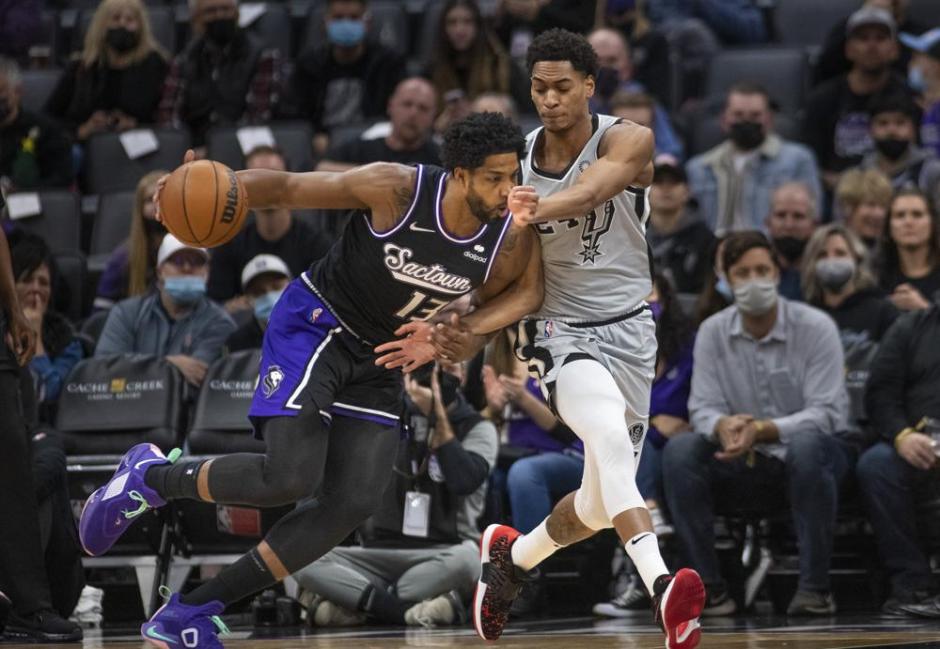 San Antonio Spurs guard Devin Vassell (24) guards against Sacramento Kings center Tristan Thompson (13) Sun Dec 18, 2021 at Golden One Center in Sacramento in the first half of NBA action. (AP News photo)