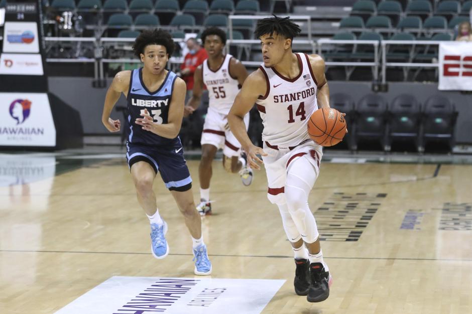 Stanford Cardinal leading scorer Spencer Jones drives down the court against the Liberty Flames at the Diamond Head Classic in Honolulu on Thu Dec 23, 2021 the last time Stanford played before the Covid 19 quarantine forced them to stop (AP News photo)