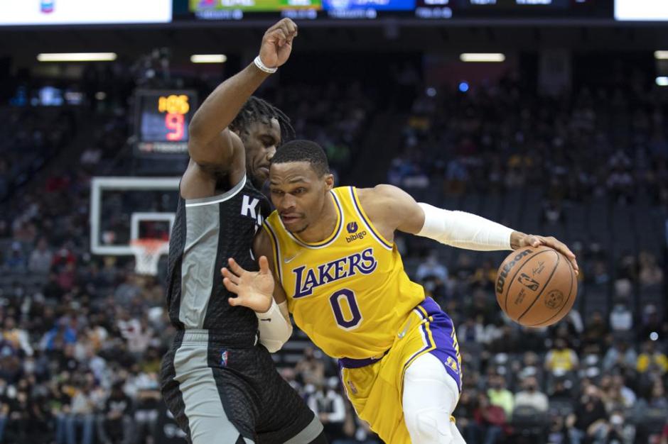 Los Angeles Lakers guard Russell Westbrook (0) attempts to get past Sacramento Kings guard Davion Mitchell (left) at Golden One Arena in Sacramento on Thu Jan 13, 2022. The Kings open a two game set starting Fri Jan 14, 2022 against the Houston Rockets in Sacramento (AP News photo)