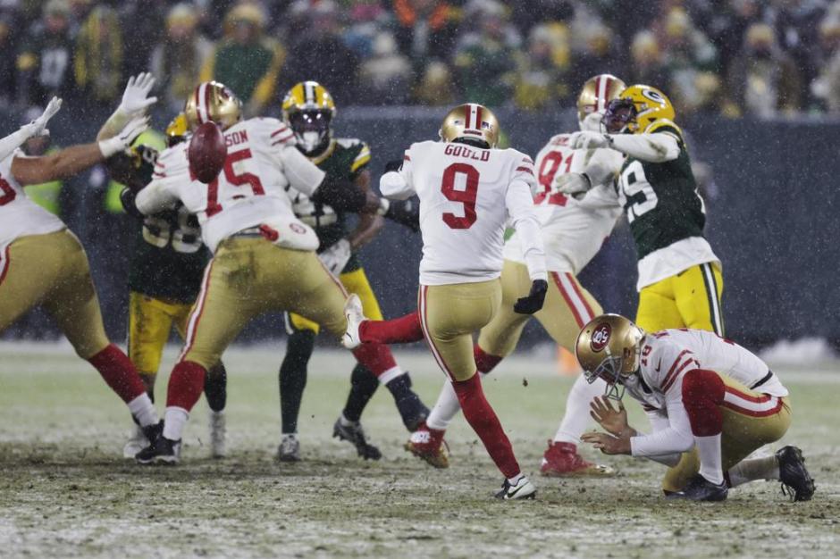 San Francisco 49ers kicker Robbie Gould boots one through the uprights for the game winner against the Green Bay Packers on Sun Jan 22, 2022. The 49ers visit the Los Angeles Rams at SoFi Stadium in Los Angeles Sun Jan 30, 2022 in the NFC Championship (AP News photo)