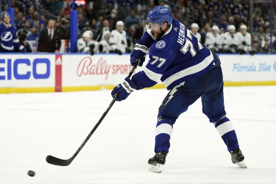 The Tampa Bay Lightning’s Victor Hedman (77) scores a overtime goal to defeat the San Jose Sharks at Amalie Arena in Tampa Bay on Tue Feb 1, 2022 (AP News photo)