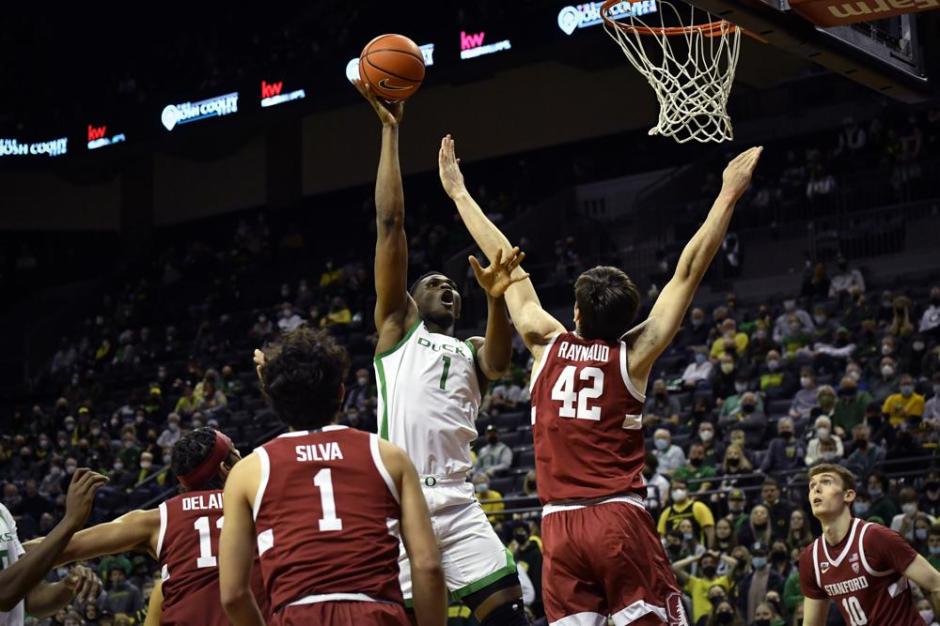 Oregon center N’Faly Dante (1) shoots over Stanford forward Maxime Raynaud (42) at Matthew Knight Arena in Eugene on Thu Feb 10, 2022 (AP News photo)