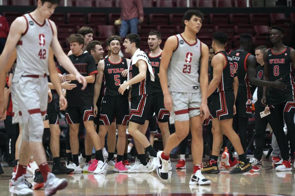 The agony of defeat and the thrill of victory all in one photo as Stanford Cardinal players walk off the floor as the Utah Utes celebrate in the foreground at Utah University on Thu Feb 17, 2022 (AP News photo)