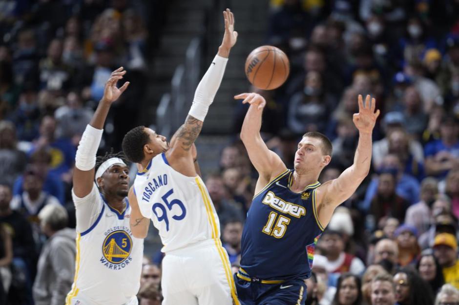 Denver Nuggets center Nikola Jokic, right, gets the ball away as Golden State Warriors forward Juan Toscano-Anderson, center, and center Kevon Looney try to put pressure on Jokic at the Ball Center Arena in Denver on Mon Mar 7, 2022 (AP News photo)